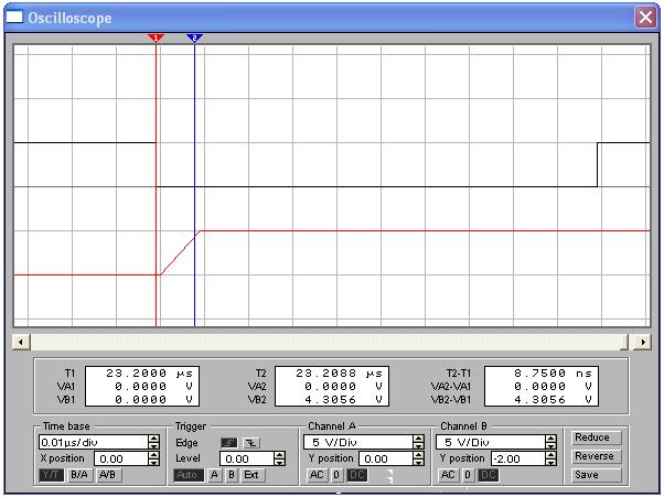 На рис. 2 представлена схема исследования асинхронного RS- триггера с инверсными входами в программе EWB, а на рис. 3, 4 приведены временные диаграммы для определения функционирования и времени переключения триггера.