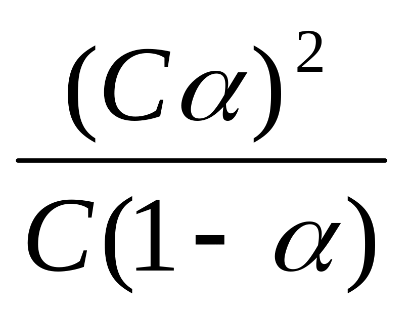 Если обозначить концентрацию электролита, распадающегося на два иона, через С, а степень его диссоциации в данном растворе через , то концентрация каждого из ионов будет С, а концентрация недиссоциированных молекул С(1 - ). Тогда уравнение константы диссоциации (2.1) примет вид: