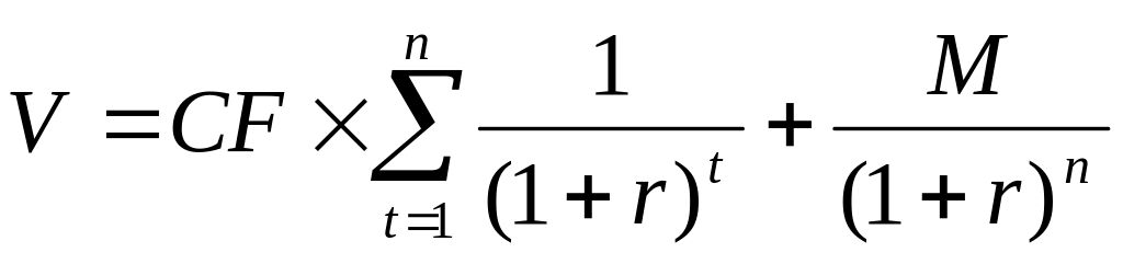 Стоимость облигации может быть представлена в виде текущей стоимости будущих фиксированных потоков денежных средств по долгу: процентных платежей и основной суммы долга.