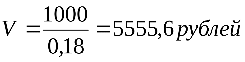 Рассчитать стоимость бессрочной облигации, если выплачиваемый по ней годовой доход составляет 1000 рублей, а приемлемая норма доходности 18%.