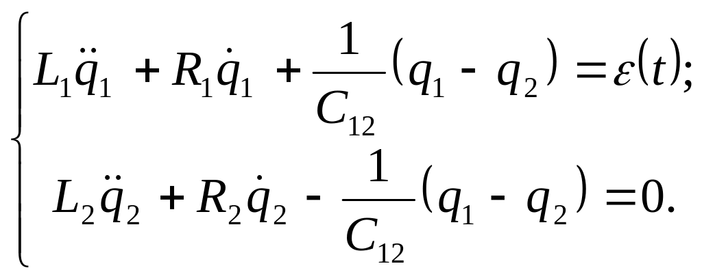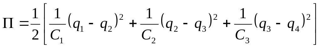 Как и в предыдущем примере определим число степеней свободы электрической цепи, составим выражения для , , , вычислим обобщенные силы и запишем систему уравнений.