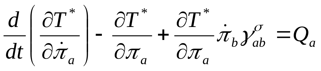 Рассмотрим динамическую систему, на движение которой наложена кинематическая связь. При этом вектор скорости одной из точек тела системы сохраняет свое направление по отношению к этому движущемуся телу. Для механической системы эта связь типична в случае, когда твердое тело, двигающееся по поверхности, имеет острие, врезающееся в неподвижную поверхность – вектор скорости точки острия сохраняет свое направление относительно тела. Для электромеханической системы кинематическую связь можно представить как проводник с током, положение которого не меняется относительно подвижной части системы (ротора). В этих случаях кинематическая связь, накладываемая на скорости (токи), является неинтегрируемой. Уравнения Лагранжа (4), записанные в голономных координатах, для исследования подобных систем неприменимы. Необходимо вводить новые неголономные координаты и использовать уравнения движения в этих координатах. Такие уравнения можно представить в виде (форма Лагранжа-Эйлера):