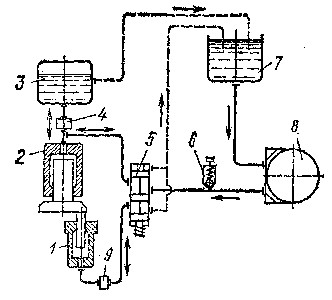В положении холостого хода вниз жидкость поступает из наполнительного бака в рабочий цилиндр, при этом возвратные цилиндры соединяются со сливным баком. С целью увеличения скорости движения поперечины при холостом ходе в наполнительный бак подается избыточное давление воздуха равное 0,5 - 0,8 атм, или наполнительный бак устанавливается выше рабочего цилиндра, и тогда подпор жидкости обеспечивается за счет разности уровней.