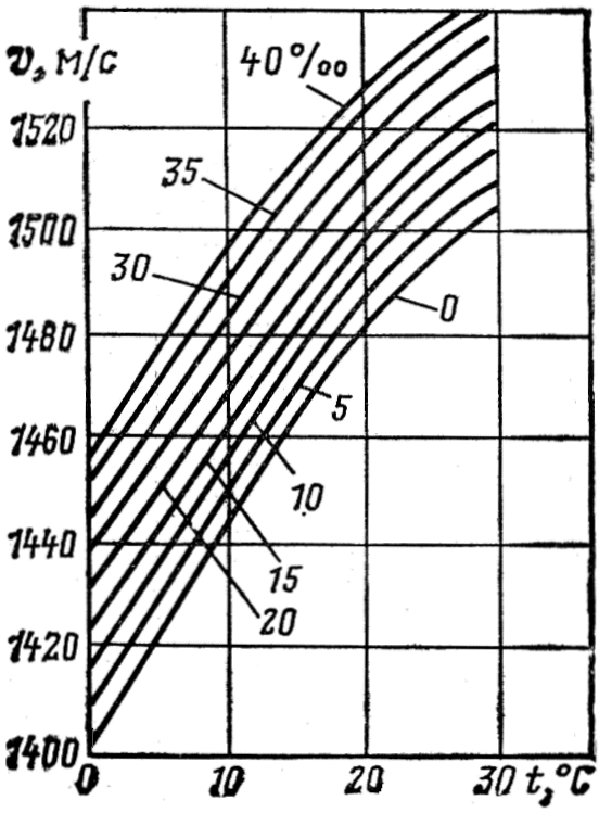Первый шаг на пути оцифровки «бумажного» графика – это его сканирование, получение его электронного растрового изображения – файла. Такой файл (изображение) требует минимальной последующей доработки – поворота при необходимости изображения с помощью какого-нибудь графического редактора так, чтобы ось ординат была строго горизонтальна, а ось абсцисс, соответственно, вертикальна. Но часто и этого не требуется, если страница справочника с графиком была установлена в сканере аккуратно без перекосов. Для этого иногда приходиться, увы, разрывать книги на отдельные страницы и ровно обрезать их края. С другой стороны, если не книгу (страницу книги) несут к сканеру, а сам сканер (ручной сканер) несут к книге и проводят им по раскрытой странице, то может потребоваться дальнейшая обработка – разворот графика и т.д. На рис. 18 показан график, отсканированный из справочника «Физические величины» (М.: Энергоатомиздат, 1991) и показывающий влияние температуры и солености морской воды на скорость звука в ней.