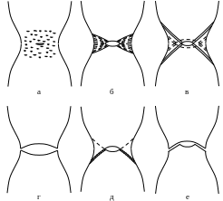 Рис. 10.2. Схема формирования чашечного излома: а) образование микротрещины; б) рост трещины; в) рост трещины вдоль плоскостей локализованного сдвига; г) разрушение по типу «двойная чашечка»; д) перераспределение пор вдоль ослабленной полосы сдвига; е) разрушение «чашечка-конус»