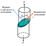 λ – угол между направлением скольжения и направлением нормали, φ – угол между нормальным напряжением и нормалью к плоскости скольжения.