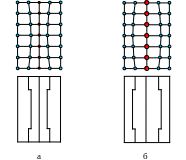 Если учитывать размер атомов замещения и схему взаимодействия с матричными атомами, то можно выделить две схемы деформирования кристаллической решетки в зависимости от размера атомов, как показано на рисунке 4.8. На рис. 4.8 а – диаметр атомов замещения меньше чем диаметр атомов основного вещества. На рис. 4.8 б – диаметр атомов замещения больше чем диаметр атомов основного вещества.