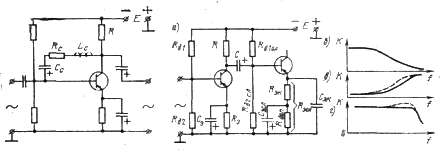 Поэтому в широкополосных каскадах предварительного усиления с биполярными транзисторами используют схемы коррекции, вводящие в каскад достаточно глубокую отрицательную обратную связь, сильно уменьшающую изменения коэффициента усиления и характеристик каскада при замене транзистора, старении и воздействии на каскад других факторов. Рассмотрим наиболее употребительные схемы этого типа и их основные свойства.
