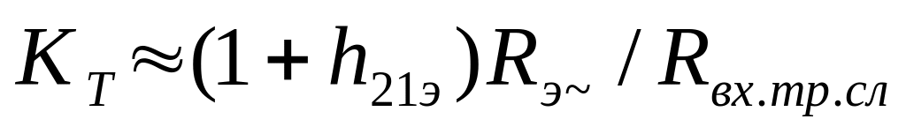 Коэффициент усиления напряжения повторителей из-за имеющейся в них отрицательной обратной связи меньше единицы. Первые два выражения определяют сквозной и обычный коэффициенты усиления напряжения эмиттерного повторителя, а третье — коэффициент усиления напряжения истокового повторителя, у которого вследствие очень высокого входного сопротивления К* К.