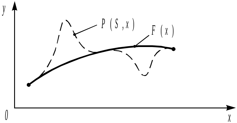 содержащих n неизвестных. Если и n=k, то эта система имеет единственное решение при определителе, отличном от нуля. Проблемы существования решений в более сложных случаях и методы решения в этих случаях рассматриваются в линейной алгебре. Условия близости, налагаемые на функции F(х) и Р(S,x) при интерполяции, выполняются только в узлах. Поэтому в не узловых точках отклонения этих функций могут быть недопустимо большими (рис. 3.10).