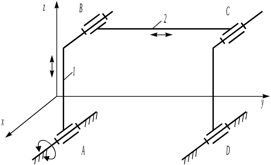 Данное условие приведет к тому, что механизм обратится в плоский. Здесь невозможны три движения – вращение вокруг осей Y и Z и перемещение по X. Возможно вращение вокруг X и перемещение по Z и Y. Это обстоятельство влечет за собой изменение и структурной формулы: