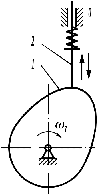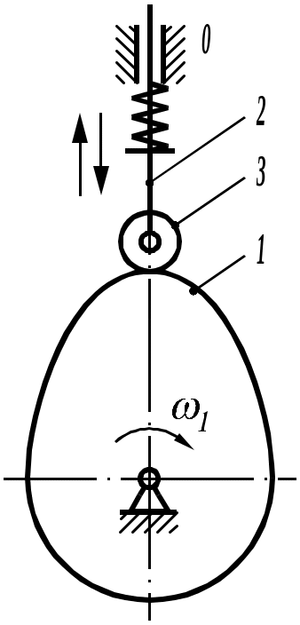 Степень подвижности кулачкового механизма (рис. 1.14) равна W = 2. Нужны два ведущих звена? Нет. Одну лишнюю подвижность дает ролик (звено 3), он вращается вокруг своей оси и поднимается вместе с толкателем. Если профиль кулачка выполнить по эквидистантной кривой, то механизм примет вид, представленный на рис. 1.15.