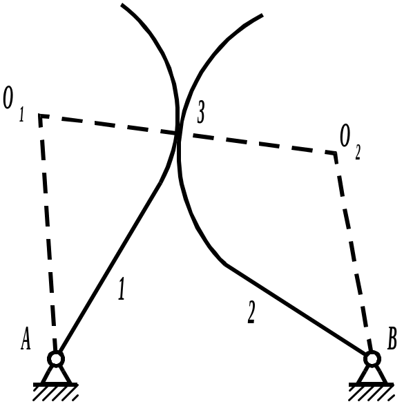 Всякая высшая пара заменяется одним фиктивным звеном и двумя низшими кинематическими парами. Оба предъявляемые к нему требования выполняются. О1О2 – фиктивное звено; AO1 О2 B – заменяющий механизм.