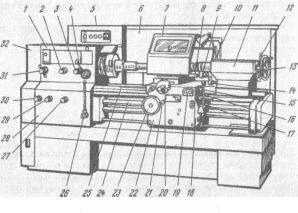 Для управления приводом подачи служат рукоятки: 2 - для установки нормального или увеличенного шага резьб, 3 - для изменения направления нарезаемой резьбы, 30,29, 27 - для установки величины подачи или шага резьбы. Рукояткой 21 включают и выключают реечную шестерню продольной подачи, а рукояткой 18 - подачу суппорта; включение ускоренной подачи в любом направлении осуществляется рукояткой 15. Для включения и выключения гайки ходового винта 24 служит рукоятка 16. Маховичками 23 и 20 производится ручное перемещение суппорта соответственно в продольном и поперечном направлениях; с помощью маховичка 9 перемещают верхние салазки суппорта.