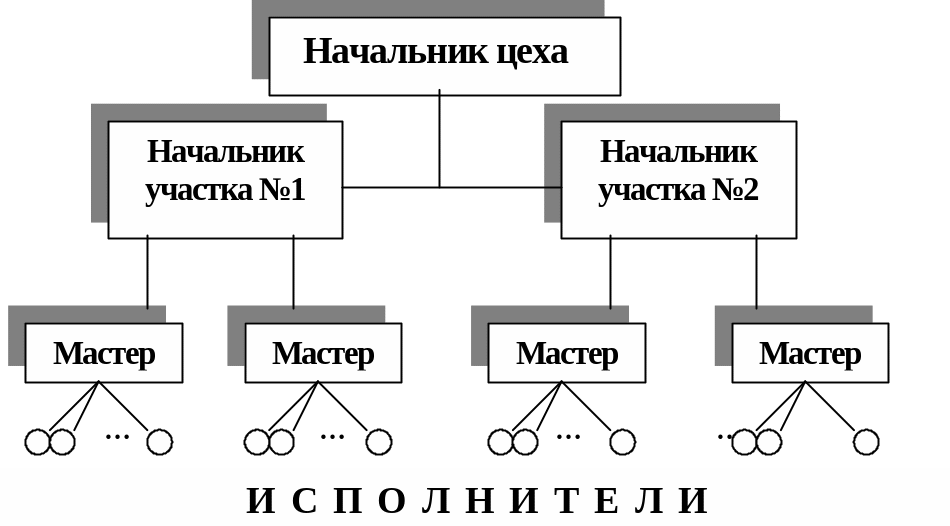 На верхнем уровне деления цеховой структуры находится цех (отдел). Такая структура используется преимущественно в фирмах среднего размера.