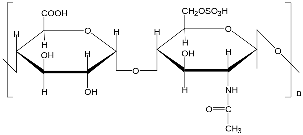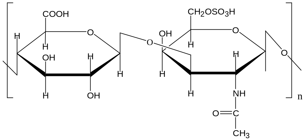 1. D-глюкуроновая кислота (β1→3) 2. N-ацетил-D-галактозамин-4-сульфат (β1→4) |