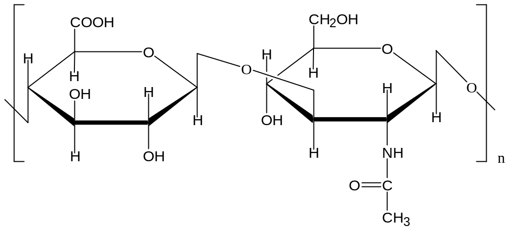 Гиалуроновая кислота содержит несколько тысяч дисахаридных единиц, молекулярная масса её достигает 105—107 Да.