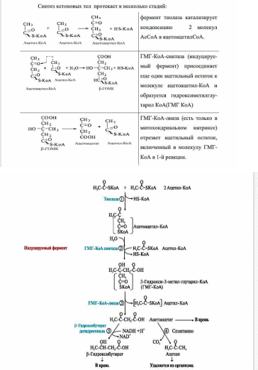 фермент тиолаза катализирует конденсацию 2 молекул АсСоА в ацетоацетилСоА. ГМГ-КоА-синтаза (индуцируемый фермент) присоединяет еще один ацетильный остаток к молекуле ацетоацетилКоА и образуется гидроксиметилглутарил КоА(ГМГ КоА) ГМГ-КоАлиаза (есть только в митохондриальном матриксе) отрезает ацетильный остаток, включенный в молекулу ГМГКоА в 1-й реакции.