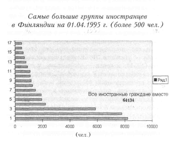 Прилагаемый ниже график (Коркиасаари, 1995, Korkiasaari) показывает, что в Финляндии в 1995 году проживало более 64000 иностранцев. Самые большие группы — из России, Эстонии, стран бывшего Советского Союза и Швеции. Некоторые группы беженцев представляют страны, которые по своей культуре значительно отличаются от Финляндии.