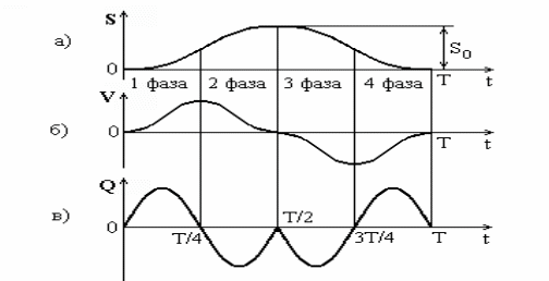 Диаграмма этого процесса приведена на рис.1(a). Тогда, дважды дифференцируя функцию S(t), получим уравнения скорости V(t) = dS/dt перестройки управляемой структуры (с размерностью виброскорости) и плотности энерго-информационного воздействия на единицу массы по второму закону Ньютона Q = (1/m)dE/dS = d2S/dt2 (с размерностью виброускорения, где Е — энерго-информация управляющего сигнала). Диаграммы этих процессов приведены на рис.1(б, в), где видно их характерное разделение в пределах четырех фаз равной длительности T/4.