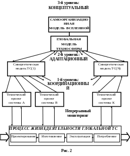 Все это требует от человечества перехода к осознанной трехуровневой структуре управления техносферой [5], обобщенная схема которой приведена на рис. 2. Такие уровни управления реализованы и в отдельных ТС и в техносфере в целом, но в общественном сознании существует только низший координационный уровень, что исключает в настоящее время осознанное участие в управлении самоорганизующейся техносферой.