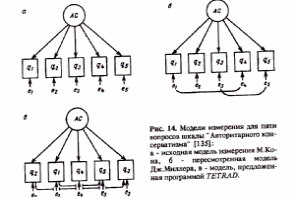 Эффект "закрепления" (или "установки на якорь") известен в экспериментальной психологии и описывает механизм возникновения ситуации, когда результаты одного психического процесса (оценки величины стимула, решения задачи и т.п.) используются как исходная точка, база для другого процесса. Содержательная интерпретация эффекта может основываться на понятиях "уровня адаптации", "стимульного контекста" или "сохранения когнитивного баланса". Последнее объяснение весьма убедительно, когда речь идет о порядке вопросов АС-шкалы. Их смысловая связанность и общая нацеленность обеспечены специальными процедурами (см. выше) и, вероятно, очевидны не только для исследователя, но и для респондента. Стремясь к тому, чтобы его ответы были согласованы и последовательны, респондент будет учитывать свои предыдущие ответы, используя их как исходную точку. Результаты применения TETRAD подтвердили преимущества модели измерения, предусматривающей прямые причинные влияния между вопросами АС-шкалы, т.е. гипотезу о том, что корреляции между ответами, не связанные с их зависимостью от латентного фактора "Авторитарного консерватизма", объясняются причинными отношениями между самими вопросами-индикаторами (а не необъясненными корреляциями их ошибок измерения). На рис.14 представлены исходная модель измерения "Авторитарного консерватизма", пересмотренная модель Дж.Миллера с коррелированными ошибками и одна из двух переработок исходной модели, предложенных TETRAD51. Анализ модели измерения для пяти вопросов АС-шкалы проводился до того, как стала известна их временная последовательность в интервью, т.е. вопросы нумеровались условно. Поскольку две модели, найденные TETRAD, ограничивали порядок четырех вопросов из пяти (между которыми вводились прямые причинные связи), то программа фактически "выдала" определенные утверждения о реальной последовательности вопросов. Одно из них, как выяснилось позднее, действительно соответствовало тому порядку, в котором они задавались в исследовании Кона. Статистическая проверка предложенных TETRAD моделей с помощью программы EQS также подтвердила высокую степень их соответствия данным. Этот анализ, наряду с другими вторичными исследованиями, проведенными разработчиками TETRAD, позволяет очертить пределы, в которых практическую применимость программы можно считать в достаточной мере доказанной.