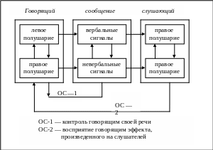 Речевая деятельность осуществляется абстрактно мыслящим левым полушарием головного мозга, где расположены «центры речи». Это полушарие считается «говорящим». Правое полушарие не участвует в речевой деятельности, так как не способно воспринимать словесные смыслы, но зато оно реагирует на внелингвистические, невербальные сигналы. В силу того, что вербальные и невербальные каналы работают параллельно, речь и жестикуляция дополняют друг друга, устная коммуникация оказывается двухканальной, а если учесть каналы обратной связи, то и четырехканальной (см. рис. 4.3)51.