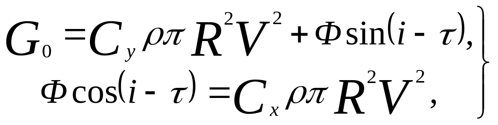 где G0 - полный вес автожира, Ф - потребная тяга пропеллера, τ - угол между осью пропеллера и плоскостью вращения ротора (плоскостью вращения считается плоскость, перпендикулярная к оси ротора).