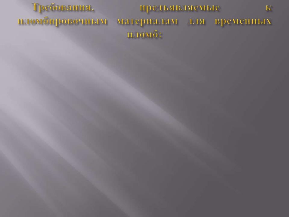 Пломбировочные материалы для временных пломб должны быть безвредными для организма, иметь хорошую пластичность при введении в полость, быть нерастворимыми в слюне, обладать достаточной прочностью, обеспечивать герметическое закрытия полости, быть непроницаемыми для слюны и лечебных веществ, относительно легко выводиться из кариозной полости после затвердения.
