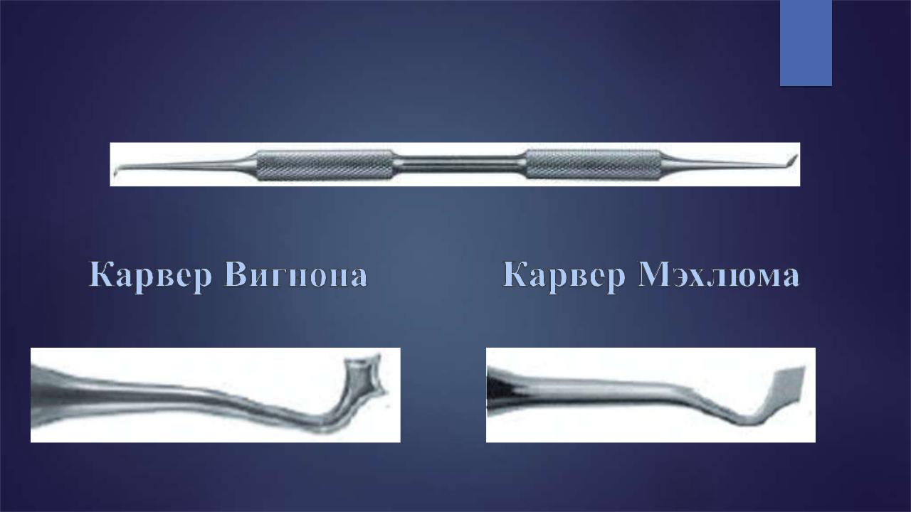 •инструменты для обработки апроксимальных и придесневых поверхностей (карверы Гуртсена, Виланда, Холленбэка, Нистрома и малоразмерные скейлеры);