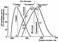 Родопсин палочек наиболее чувствителен при действии волны 505 нм. Цветочувствительные пигменты колбочек, состоящие из ретиналя и фотопсина (белковая часть его несколько отличается от скотопсина палочек), имеют пики чувствительности: голубочувствительные - 445 нм, зелено-чувствительые - 535 нм и красночувствительные при 570 нм (рис. 6.25).