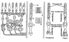 В рецепторных клетках ионы кальция слабо связаны с метародопсином, либо с соседними мембранными белками. Запускаемый цикл фотохимических процессов при участии кальмодулина активирует ионы Са2+. Свободный кальций и другие вторичные посредники (цГМФ) диффундируют к плазматической мембране, где изменяют ее проницаемость для Nа+: возникает рецепторный потенциал (РП) (рис. 6.24). Но РП, возникающий в фоторецепторах под действием кванта света, обусловлен не деполяризацией, как в других рецепторах, агиперполяризацией мембраны рецепторной клетки. В темноте мембрана их сравнительно хорошо пропускает ионы натрия, что приводит к низкому уровню ее поляризации (около -25 мВ). При действии света проницаемость натриевых каналов снижается, поэтому потенциал мембраны возрастает. Причем, амплитуда гиперполяризации растет с увеличением освещенности (максимально до -90 мВ).