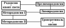 В фоторецепторах происходит взаимодействие кванта света с пигментом. Рассмотрим эти процессы на примере хорошо изученного взаимодействия света с родопсином. Родопсин представляет собой высокомолекулярное соединение (мол. масса 270000), состоящее из альдегида витамина А - ретиналяи белкаопсина. Фотохимические превращения зрительных пигментов начинаются с поглощения ими фотона и перехода на более высокий энергетический уровень, сопровождающийся ихстереоизомеризацией. При этом происходит поэтапное образование ряда промежуточных продуктов, в конечном итоге чего разрывается связь ретиналя с опсином (рис. 6.23).