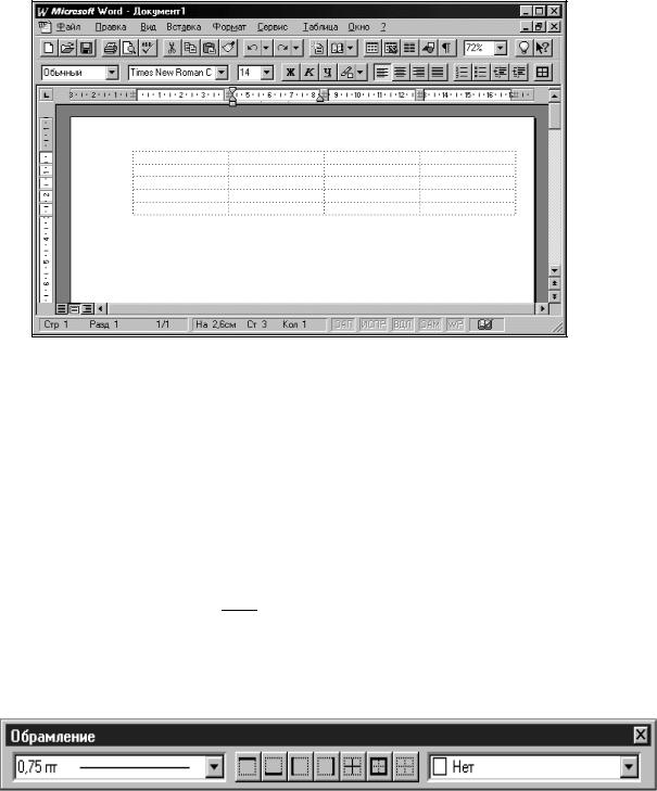 В этом окне нужно задать количество строк и столбцов, и после нажатия на кнопку «ОК» в документ будет вставлена нужная таблица. Сначала таблица не имеет обрамления, т.е. при распечатке документа не будет видна сетка, однако для удобства работы она на экране обозначается пунктирной линией (рисунок 6).