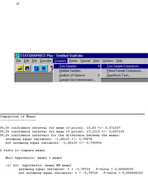Рис. 13. Выбор процедуры сравнения двух выборок в ППП Satgraphics