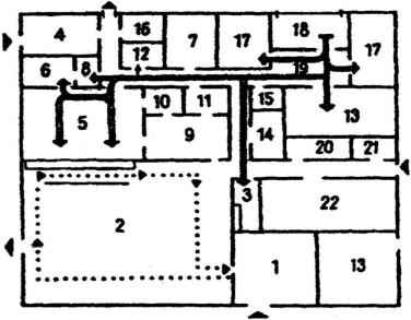 1 – вестибюль с гардеробом и санузлами; 2 – обеденный зал с раздаточной; 3 – буфет; 4 – помещение продажи обедов на дом; 5 – горячий цех; 6 – холодный цех и хлеборезка; 7 – техническое помещение; 8 – доготовочный цех; 9 – моечная столовой посуды; 10 – моечная кухонной посуды; 11 – моечная тары полуфабрикатов; 12 – помещение заведующего производством; 13 – охлаждаемые камеры; 14 – машинное отделение охлаждаемых камер; 15 – техническое помещение; 16 – камера отходов; 17 – кладовые продуктов; 18 – крытая разгрузочная площадка; 19 – загрузочная; 20 – служебные помещения; 21 – 22 – гардеробы и санузлы персонала.