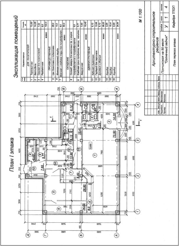 1 – вестибюль с гардеробом и санузлами; 2 – обеденный зал; 3 – раздаточная; 4 – буфет; 5 – помещение для игр; 6 – холодный цех и помещение для резки хлеба; 7 – горячий цех; 8 – цех мучных изделий; 9 – моечная столовой посуды; 10 – моечная кухонной посуды; 11 – доготовочный цех; 12 – машинное отделение охлаждаемых камер; 13 – охлаждаемые камеры; 14 – кладовые продуктов; 15 – загрузочная; 16 – бытовые помещения; 17 – служебные помещения; 18 – технические помещения; 19 – помещение заведующего производством; 20 – помещение слесаря; 21 – радиоузел; 22 – крытая разгрузочная площадка; 23 – помещения персонала.