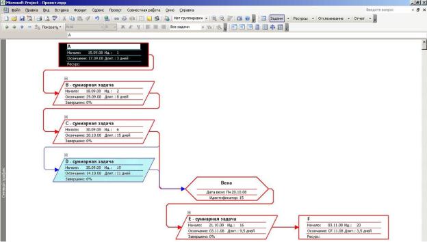 План проекта в других представлениях MS Project выглядит следующим образом: Календарь – рисунок 16, Сетевой график (подзадачи проекта скрыты) – рисунок 17. Представления изменяем через пункт меню Вид.