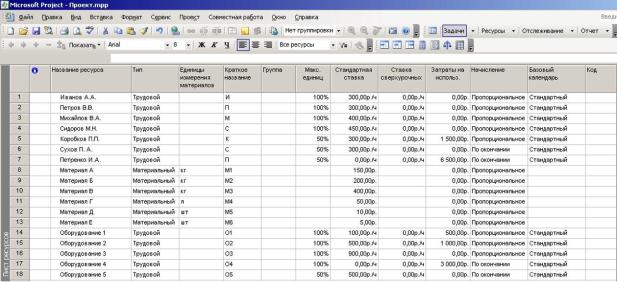 1.Определите состав ресурсов проекта и заполните Лист ресурсов. В проекте должно использоваться не менее 15 ресурсов всех типов.
