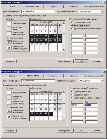 Зададим персональное рабочее время для ресурса Михайлов В.А.: с 13.10.2008 по 26.10.2008 – нерабочее время (отпуск), а для ресурса Сидоров М.Н. с 27.10.2008 по 31.10.2008 установим рабочее время во второй половине дня. Открываем вкладки Рабочее время окна Сведения о ресурсе указанных ресурсов, выделяем требуемые даты, устанавливаем переключатель в нужное положение для первого ресурса, устанавливаем переключатель и вводим новое рабочее время для второго ресурса (рисунок 19).