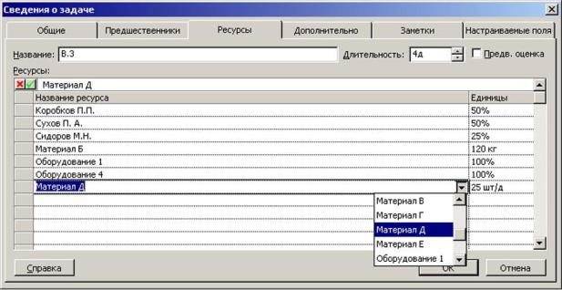 Примечание: Количество трудовых ресурсов измеряется в процентах, т.е. сколько процентов своего рабочего времени тратит ресурс на выполнение данной задачи. Количество материальных ресурсов – в единицах измерения ресурса (шт., кг и т.д.) или в единицах ресурса на единицу времени (шт./ч, кг/д и т.д.).