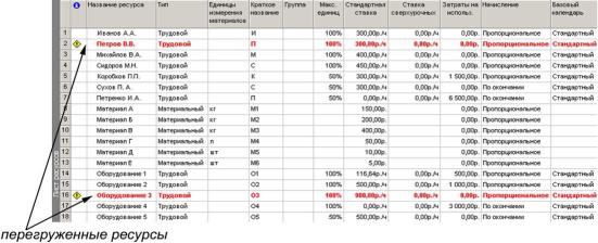 сурсов, Использование ресурсов, График ресурсов (пункт меню Вид). Все ресурсы, загрузка которых превышает доступность, выделены красным цветом и специальным значком (Лист ресурсов представлен на рисунке 26).