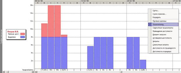 лее подробную информацию, позволяя узнать, на какие дни и задачи приходится перегрузка ресурса. Участок графика ресурсов, отображающего трудозатраты ресурса Петров В.В., представлен на рисунке 27. Выбор данных, отображаемых на графике, осуществляется в контекстном меню, вызываемом щелчком правой кнопкой мыши в правой области графика.
