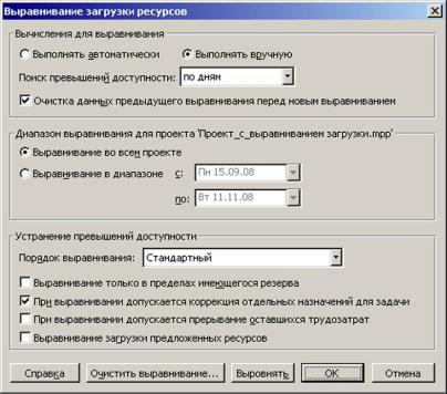 ция только отдельных назначений для задачи, а не всей задачи; допускается ли при выравнивании прерывать задачи (флажок При выравнивании допускается прерывание оставшихся трудозатрат).