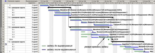 На этой разновидности диаграммы Ганта отображаются текущий план проекта (план после выравнивания) и состояние плана до выравнивания. Кроме этого тонкими линиями отображаются задержки задач в результате выравнивания и(или) образовавшийся резерв времени задач. Выравнивающая задержка задач, выраженная в единицах астрономической длительности, дополнительно приведена в таблице представления.