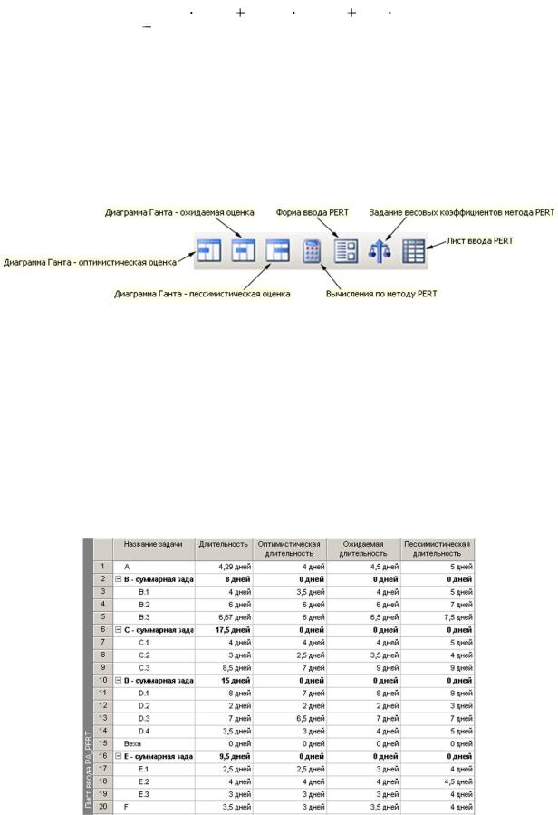 где ТОПТ, ТОЖИД, ТПС – оптимистическая, ожидаемая и пессимистическая длительности задач; КОПТ, КОЖИД, КПС – оптимистический, ожидаемый и пессимистический весовые коэффициенты (сумма коэффициентов должна равняться 6).