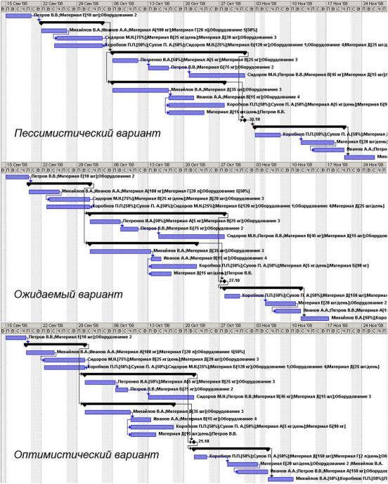 3.Просмотрите диаграммы Ганта оптимистического, ожидаемого и пессимистического вариантов плана. Сделайте вывод о возможности реализации проекта в установленные сроки.