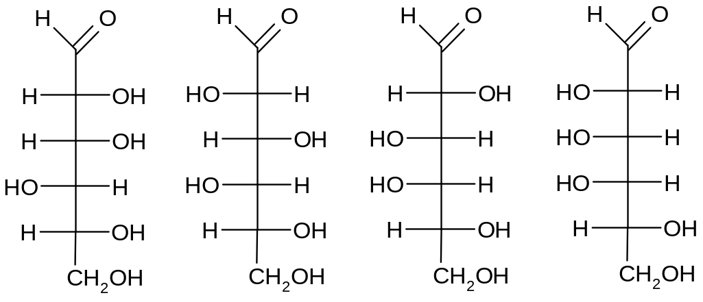 В общем случае молекула с "n" хиральными центрами имеет 2n стереоизомеров. Так, альдогексозы с 4 хиральными центрами имеют 24 =16 стереоизомеров.