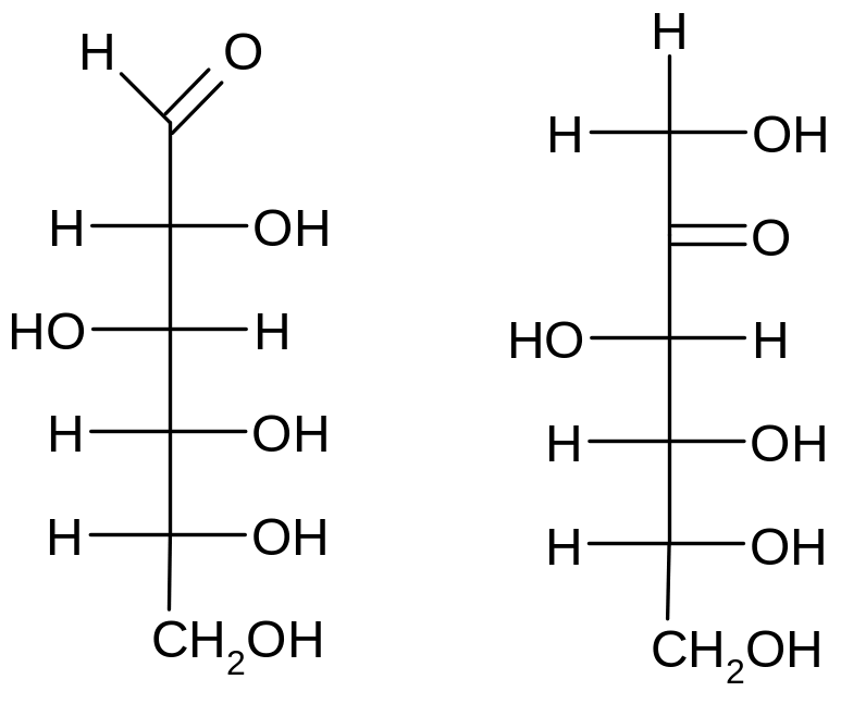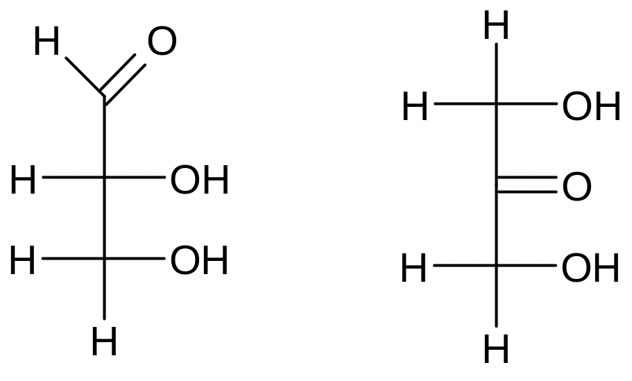 Существует два семейства моносахаридов, это - альдозы, когда на конце углеродной цепи присутствует карбонильная группа, и кетозы, когда карбонильная группа расположена в ином другом положении. Простейшими моносахаридами являются две трехуглеродные триозы - глицероальдегид и дигидроксиацетон.