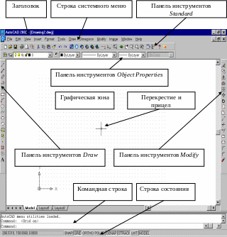 Вверху экрана находится строка заголовка, а сразу под ней строка системного меню. Ниже меню располагаются две строки, которые заняты панелями инструментов. Кроме того, имеются еще несколько панелей инструментов. Эти панели плавающие. Их можно переместить в любую удобную зону экрана. Панели инструментов позволяют запускать выполнение команд простым щелчком мыши на выбранной пиктограмме. В AutoCAD имеются 25 панелей инструментов. При стандартной компоновке экрана перед вами только четыре панели инструментов – Standard (Стандартная), Object Properties (Свойства объектов), Draw (Рисование), Modify (Редактирование). Остальные могут быть открыты при необходимости.
